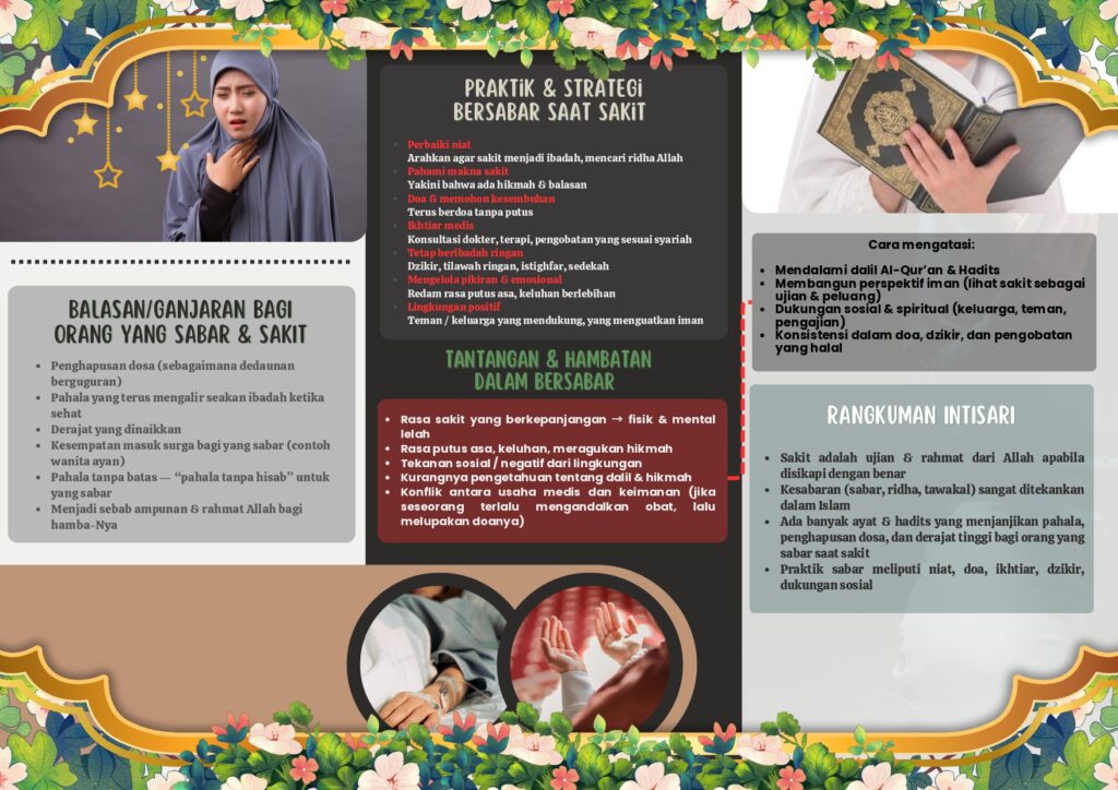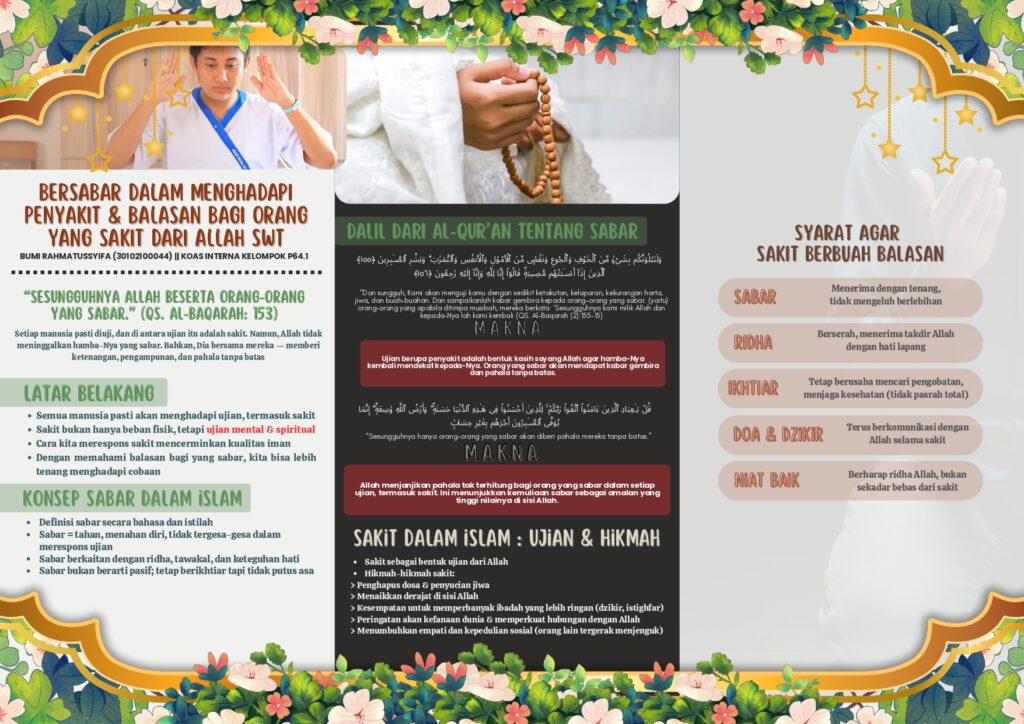 Leaflet ini mengajak kita memahami makna sabar dalam Islam bahwa sakit bukan sekadar penderitaan, tetapi sebuah ujian penuh kasih sayang yang dapat berubah menjadi pahala tanpa batas. Jangan biarkan sakit membuatmu putus asa biarkan ia menjadi jalan untuk lebih dekat dengan Allah SWT.
